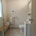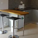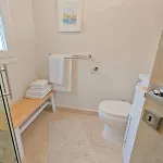 The villa comprises an equipped kitchen with an electric kettle, a fridge, and kitchenware.